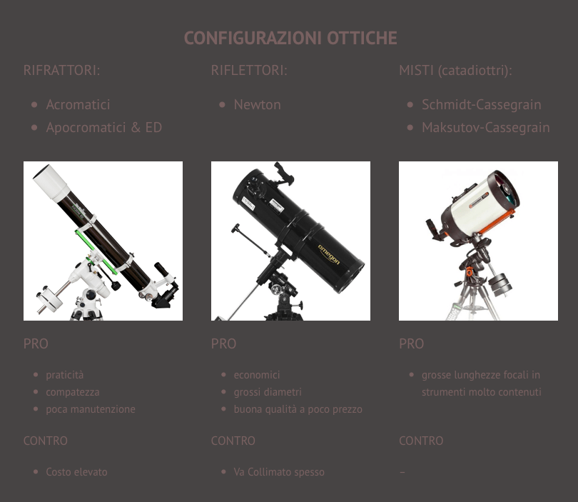 In base alla tecnica costruttiva possiamo dividere i telescopi in tre grandi gruppi. Quelli che sfruttano il principio di rifrazione della luce mediante l’uso di lenti che si chiamano, appunto, RIFRATTORI. Quelli che sfruttano il principio di riflessione della luce mediante l’uso di specchi, chiamati appunto RIFLETTORI. Poi ci sono gli ibridi, che combinano specchi e lenti, chiamati CATADRIOTTICI. Ognuno di essi ha dei pregi e dei difetti che possiamo sintetizzare nello schema qua sotto. Inoltre ogni categoria può essere suddivisa in altri sottogruppi per piccole differenze costruttive o qualitative delle ottiche. A seguire li analizzeremo nel dettaglio per far chiarezza sui pregi, difetti ed illustrare i loro schemi ottici.