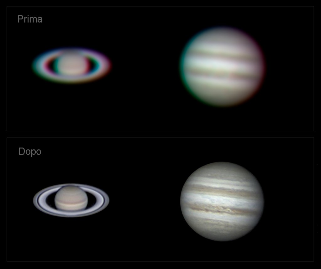 Il termine LUCKY IMAGING si può tradurre letteralmente dall’inglese in “IMMAGINI FORTUNATE”. È la tecnica usata per la fotografia planetaria ad alta risoluzione e si chiama in questo modo perché prevedere di scattare centinaia se non migliaia di foto in sequenza sullo stesso soggetto per poi darle in pasto a software specifici che si occuperanno di analizzarle e fare una prima cernita di quelle migliori. Ricordate quando prima parlavamo di turbolenza atmosferica? Ecco, questa tecnica cerca proprio di “fregare” il limite imposto dal SEEING e usa una procedura che si occupa essenzialmente di selezionare le immagini migliori ottenute quando casualmente gli strati d’aria erano più fermi. Bisogna usare tempi di scatto brevissimi perché più velocemente si apre e si chiude l’otturatore e più la nostra fotocamera sarà in grado di “congelare” l’istante perfetto. Dopo che il programma ha scartato le foto più mosse userà una seconda procedura con la quale analizzerà tutti i frame rimasti e prenderà le porzioni più nitide di ogni singolo scatto per poi farne un collage restituendoci una unica foto finale. Nell’esempio sotto vediamo la differenza tra un singolo scatto e l’immagine finale dopo l’elaborazione.