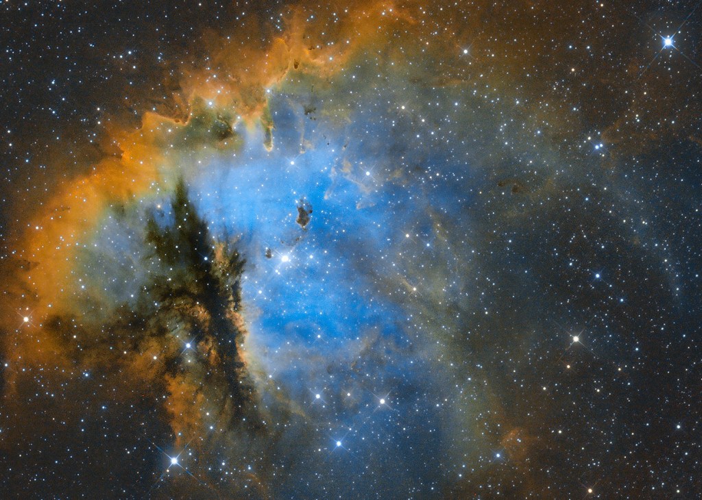 Se vogliamo fotografare nebulose e galassie, i così detti OGGETTI DEEP SKY (deep sky = profondo cielo, perchè si trovano molto lontano, al di fuori del sistema solare) dobbiamo avvalerci di fotografie a lunga posa, l’esatto contrario di quanto avviene con le riprese planetarie, in cui si usano scatti brevissimi. Il motivo di questa scelta tecnica risiede nel fatto che gli oggetti deep Sky emettono una luce molto debole per diversi motivi; in parte perchè sono davvero tanto lontani ed in parte perchè sono composti da sostanze estremamente rarefatte ( si pensi che una nebulosa oscura contiene mediamente solo 200 molecole di polvere per metro cubo). Se con i pianeti basta qualche centesimo di secondo per avere abbastanza luce per gli oggetti deep sky dovremmo tenere aperto l’otturatore della nostra fotocamera per molto tempo in modo che i loro fotoni vengano raccolti a sufficienza per restituirci un’immagine abbastanza “incisa”. La stessa tecnica si usa anche nella fotografia diurna e si chiama LUNGA POSA, ma se nelle foto diurne, anche in ambienti abbastanza bui, basta qualche secondo di posa, nell’astrofotografia deep sky c’è chi si spinge anche a scatti da 10-20 minuti!!!! Di questi scatti da 10-20 minuti ne vengono fatti davvero tanti e poi vengono sommati tra loro arrivando ad avere esposizioni totali anche di 10-20-30 ore ed oltre riprese su più notti! Nelle foto sotto vediamo la Pacman Nebula ripresa magistralmente da Andrea Maggi che con appositi filtri ha isolato le tre principali componenti di gas, poi, assegnando un colore ad ognuna di esse, è riuscito a tirar fuori questi splendidi contrasti. Si tratta della celeberrima tricromia Hubble, inventata dalla nasa per studiare la composizione molecolare delle nebulose.