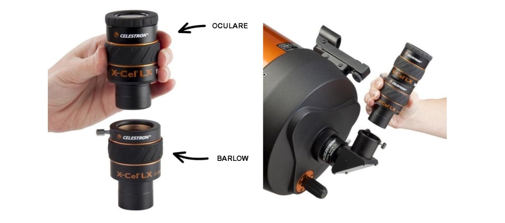 Dai disegni si può capire immediatamente che riducendo la lunghezza focale potremo vedere molti più punti sullo stesso identico piano di messa a fuoco H, aumentando di fatto il campo visivo dello strumento. Ora che abbiamo spiegato come la lunghezza focale determina campo visivo possiamo introdurre il concetto di focale equivalente. Devi sapere che la lunghezza focale può essere aumentata con l’utilizzo di alcune lenti che di fatto aumentano lo zoom. Queste lenti chiamate lenti di Barlow hanno un fattore moltiplicativo ben preciso, ad es 2x, 3x, 5x etc. e vanno inserite tra il telescopio e l’oculare (Fig.3). La focale equivalente si ottiene moltiplicando la focale nativa dello strumento per il fattore d’ingrandimento della Barlow: