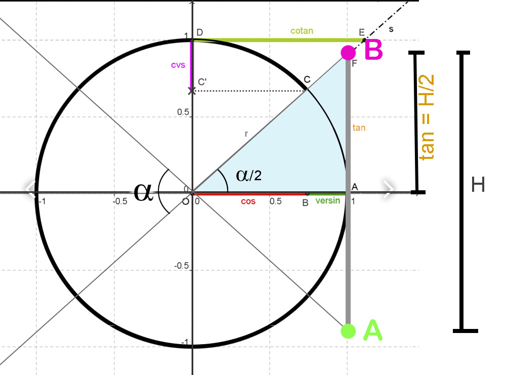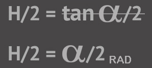 Abbiamo detto che il valore di tangente (che corrisponde ad H/2) per angoli piccoli è simile all’angolo α espresso in radianti. Questo è un punto fermo ed è misurabile…. e per noi è una gran fortuna! Quindi, per quanto detto sopra, potremo omettere il valore << tan α >> e sostituirlo con << α Rad >>.