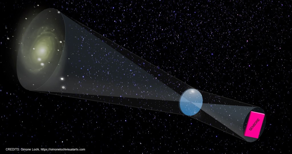 Se gli ingrandimenti ci dicono quanto zoom abbiamo il FOV ci restituisce una valore numerico ancora più utile e preciso, soprattutto al fine di alcuni calcoli che serviranno per le riprese digitali, uno su tutti il campionamento, che vedremo dopo. Il FOV ( Field Of View = Campo di vista ) infatti altro non è che l’angolo di apertura visuale che ci offre la nostra ottica. Lo possiamo immaginare come un angolo con al vertice il nostro occhio e tutto ciò che sta dentro potrà essere inquadrato, ciò che sta fuori resterà escluso al campo visivo. Nell’articolo precedente abbiamo preso d’esempio una sola sorgente puntiforme ma per capire bene il concetto ora dovremo prendere in considerazione due punti ed analizzare l’angolo che si crea tra essi. Considerando il cono di luce che ogni sorgente proietta su una lente possiamo semplificare considerando solo la proiezione del punto sulla retta che passa per il centro ottico, quella indicata con il tratteggio. Aiutandoti con video che ho inserito sotto capirai facilmente come l’apertura a sinistra sia il nostro Field Of View e l’angolo a destra, che è identico, sia la proiezione di ciò che vede l’ottica; quest’ultimo ci aiuterà a calcolare il campionamento.