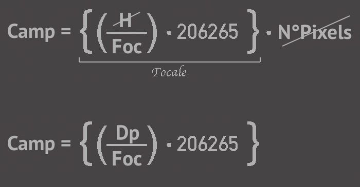 questo dato in soldoni ci indica che ogni pixel del mio sensore (su questo telescopio) “VEDE” un campo di 1,19 secondi d’arco, e non è un caso!!! I calcoli che abbiamo fatto assieme io li avevo già fatti tempo addietro, prima di acquistare la strumentazione, in modo che sensore e focale mi restituissero appunto un campionamento “ottimale” di 1,19arcsec! Un’altra formula che possiamo usare se partiamo dalla dimensione del pixel è quella che mette in relazione la sua misura con la focale dell’obiettivo (formula2). Si noti la notevole semplificazione ottenuta sostituendo in modo diretto la misura del sensore con la misura del pixel! Analizzandole bene possiamo dire che la prima formula ci dice quanto campo vedere il sensore per poi diverso per il numero di pixel, mentre la seconda ci dice direttamente quanto campo vede il singolo pixel.