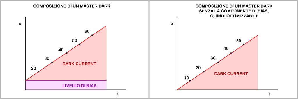 Inoltre un principio che non molti conoscono del rumore termico, ma che secondo mè è una figata pazzesca, è che esso ha una crescita costante (LINEARE) nel tempo, perciò è prevedibile! Guarda i grafici sotto e capirai subito: se io so che il rumore termico cresce di 10 elettroni al secondo allora con 5sec di esposizione avrò 50 elettroni termici da sottrarre al mio LIGHT FRAME. Questo ci permette di sfruttare un’opzione poco usata nei software di calibrazione: l’OTTIMIZZAZIONE DEL DARK FRAME. Praticamente tutti acquisiscono i DARK con la stessa durata dei LIGHT, ma grazie al processo di ottimizzazione si può usare un DARK anche di tempi diversi rispetto al light, e questo può essere comodo in alcune circostanze. Precondizione essenziale se si vuole ottimizzare un DARK con tempi diversi è avere un MASTER BIAS da dare in pasto al processo per essere sottratto al dark. Questo perchè, come detto più volte, il master dark contiene anche il BIAS oltre che il rumore termico e finché non fornisco i valori di BIAS al software esso non saprà cosa dovrà riscaldare e come. Questa sottrazione ci permette di isolare la sola DARK CURRENT per essere poi adattata ai tempi dei LIGHT.