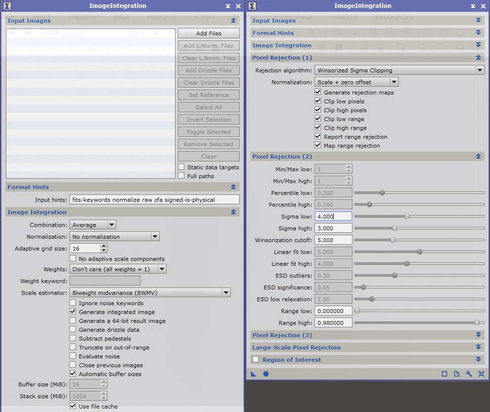Istanza di ImageIntegration aggiornata all’ultima versione di PixInsight con i giusti valori per integrare BIAS, DARK e DARKFLAT.