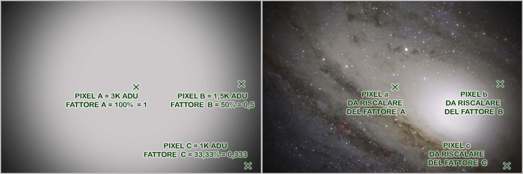 Ho preso d’esempio valori molto facili per spiegare il concetto, ma noi dobbiamo arrivarci con la matematica perchè non sempre i valori misurati sono cosi’ comodi. L’operazione che ci permette di calcolare il decadimento di luce è: VALORE PIXEL DI RIFERIMENTO / VALORE MEDIO DEI PIXEL AL CENTRO. Considerando il pixel B dell’immagine sopra, in numeri otteniamo 1500/3000=0,5 dove 0,5 è il nostro 50%. Se invece prendiamo come riferimento un pixel che misura 1000 ADU e che chiamiamo C avremo 1000/3000=0,333 che vale il 33,3% della luminosità massima, cioè 1/3, ed il decadimento di luce in questo caso è del 66,66%, cioè di 2/3. Essendo il decadimento di luce uguale sia sul FLAT che sul LIGHT ora posso calibrare il LIGHT sftuttando i FATTORI calcolati sul FLAT. Prendiamo il valore in ADU del pixel sul LIGHT, lo dividiamo per il FATTORE calcolato prima sul pixel suo omonimo nel Flat ed il gioco è fatto. In formule viene cosi’: