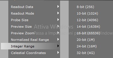 IL MENU’ DEL SISTEMA DI LETTURA VALORI DEI PIXEL IN PIXINSIGHT. SI PUO’ DECIDERE SE USARE IL PUNTATORE PER LEGGERE I VALORI DI LUMINOSITA’ DEI PIXEL ESPRESSI IN ADU OPPURE, SELEZIONANDO Normalized Real Range, VALORI IN NUMERI DECIMALI NORMALIZZATI TRA UN MASSIMO DI 1 ED UN MINIMO DI 0.